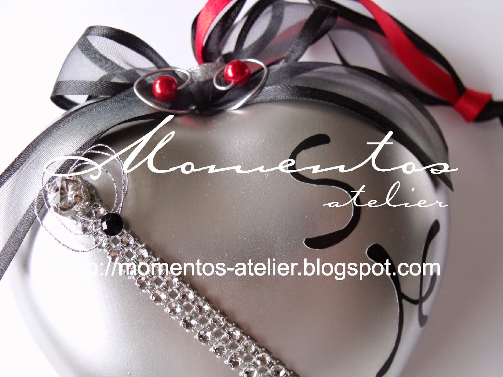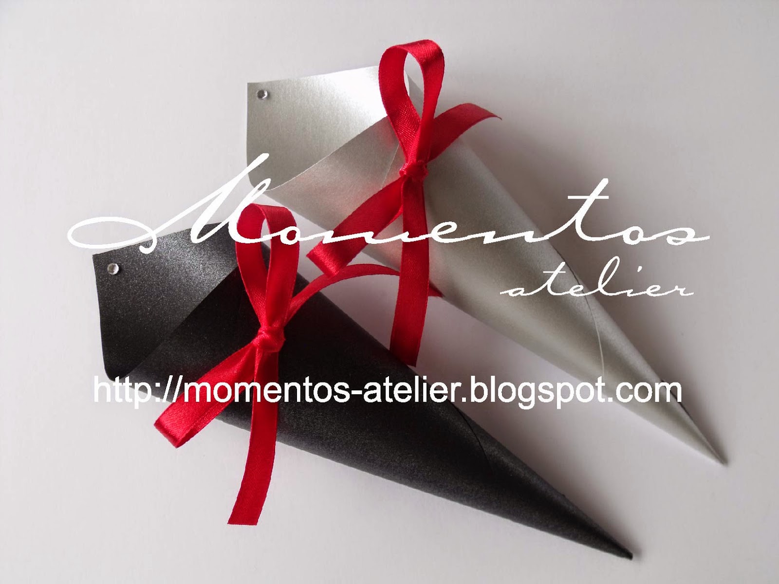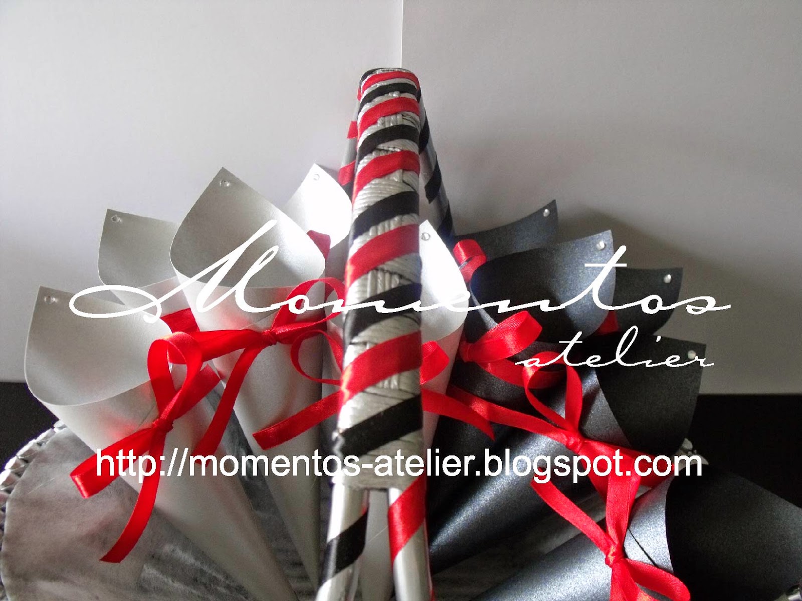 Porta alianças, Cones, Suportes para marcadores e Cestos decorados nos tons Preto, Vermelho e Prateado dos noivos Sofia & Hugo.